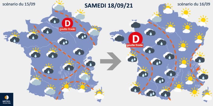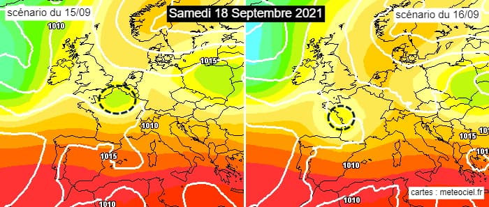Prévisions pour samedi 18 septembre 2021, scénario du mercredi 15 (à gauche) et du jeudi 16 (à droite) - Météo Villes