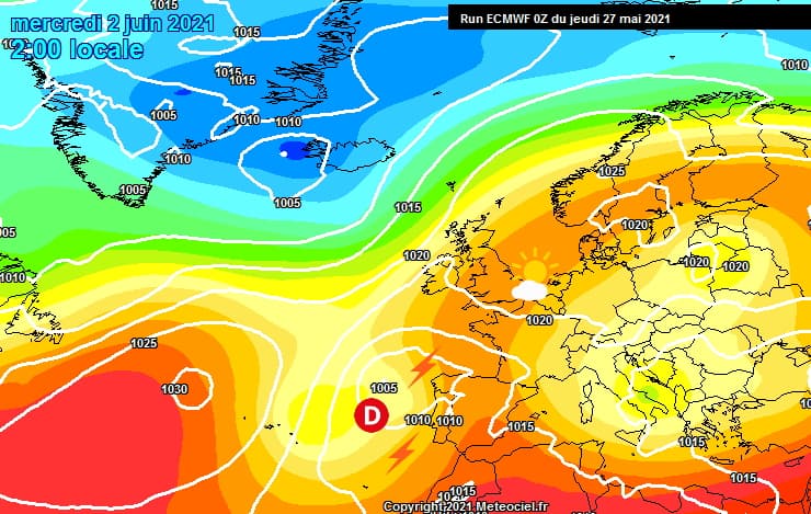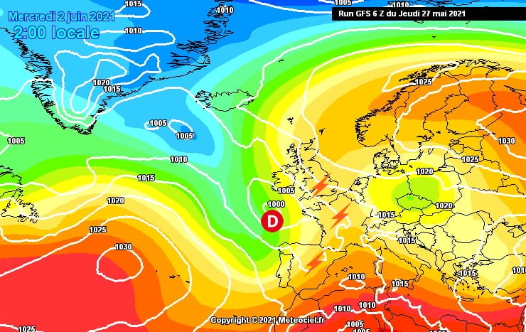 Il faut toutefois souligner que des incertitudes apparaissent sur les modèles météo dès le début du mois de juin. En effet, la plongée d'un talweg sur l'Atlantique devrait apporter une anomalie dépressionnaire au large de nos côtes. Selon le modèle américain, celle-ci se situerait assez proche de la France et contribuerait à déstabiliser la masse d'air avec des risques d'orages, notamment à partir du mercredi 2 juin 2021.