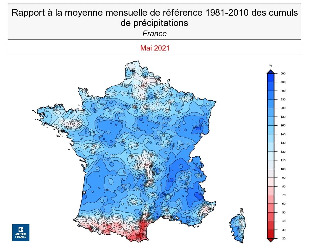 Rapport à la normale des pluies sur les deux premières décades de mai 2021 - via Météo France