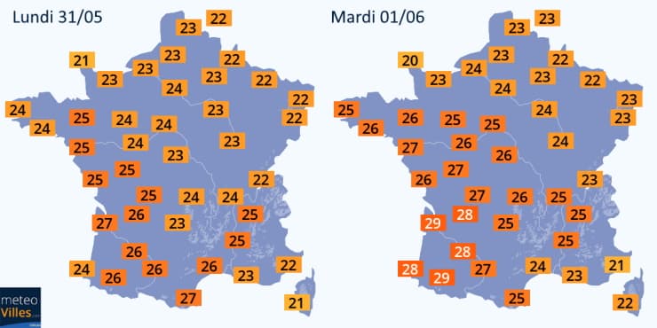 Températures maximales prévues les lundi 31 mai et mardi 1er juin 2021 - Météo Villes