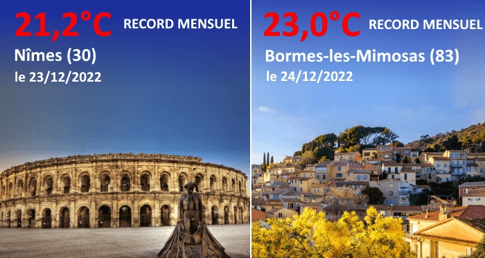 Ces deux derniers jours, des records de douceur pour un mois de décembre ont d'ores et déjà été battus dans certaines localités du sud. Ce vendredi 23 décembre 2022, la station de Nîmes-Courbessac a relevé 21,2°C. C'est la première fois que cette station atteignait les 21°C en décembre en 100 ans de mesures ! Parmi les records, on notait aussi 22,5°C à Béziers. Ce samedi 24 décembre 2022, ce fut au tour de Bormes-les-Mimosas dans le Var de battre son record mensuel en atteignant pour la première fois les 23°C en décembre !