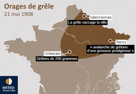On retrouve dans les archives de la presse des traces d'épisode de grêle dévastatrice en France datant d'il y a plus de 100 ans. C'est notamment le cas de l'épisode du 21 mai 1908, au cours duquel des grêlons géants sont observés du Loiret au Nord et en Lorraine. Les coupures de presse de l'époque évoque des grêlons de 250 grammes dans la région d'Orléans et une "avalanche de grêlons d'une grosseur prodigieuse" à Nancy. Dans le Nord, les médias locaux parlent d'une ville de Valenciennes "saccagée" après l'orage de grêle.