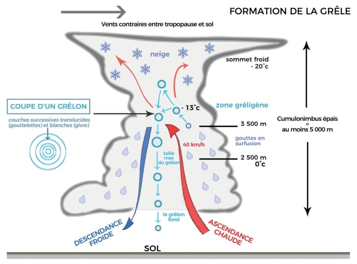 Schéma de formation de la grêle dans le cumulonimbus - via notre ouvrage "Météo Extrême"