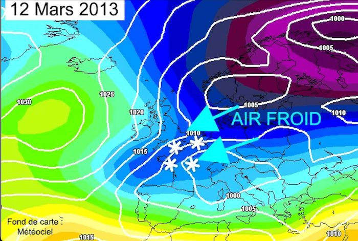 Le 10 mars 2013, un air froid venu de Scandinavie envahit le Benelux, les îles Britanniques et l’extrême nord de la France. Les températures chutent jusqu’en Île-de-France (1 °C à Lille, 5 °C à Paris). Ce froid contraste avec la douceur, parfois orageuse, qui domine sur le reste du pays.