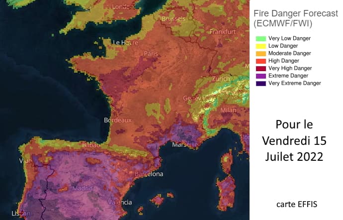 Risque d'incendies valable pour le vendredi 15 juillet 2022 - carte EFFIS