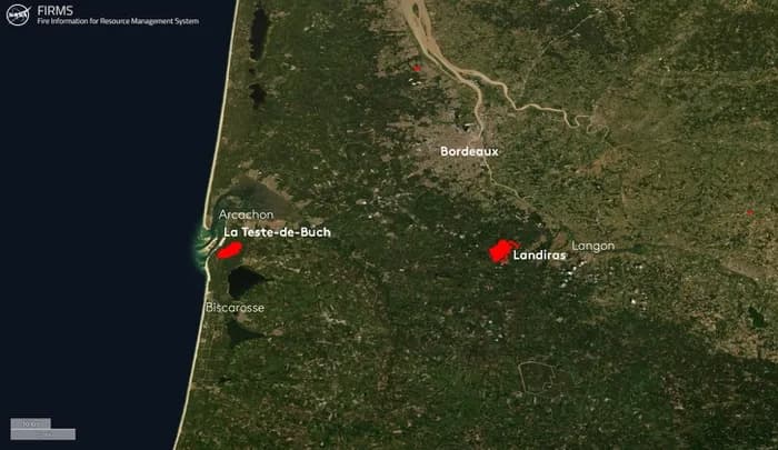 Localisation des deux foyers d'incendie en Gironde ce mercredi 13 juillet 2022 - via FIRMS / NASA