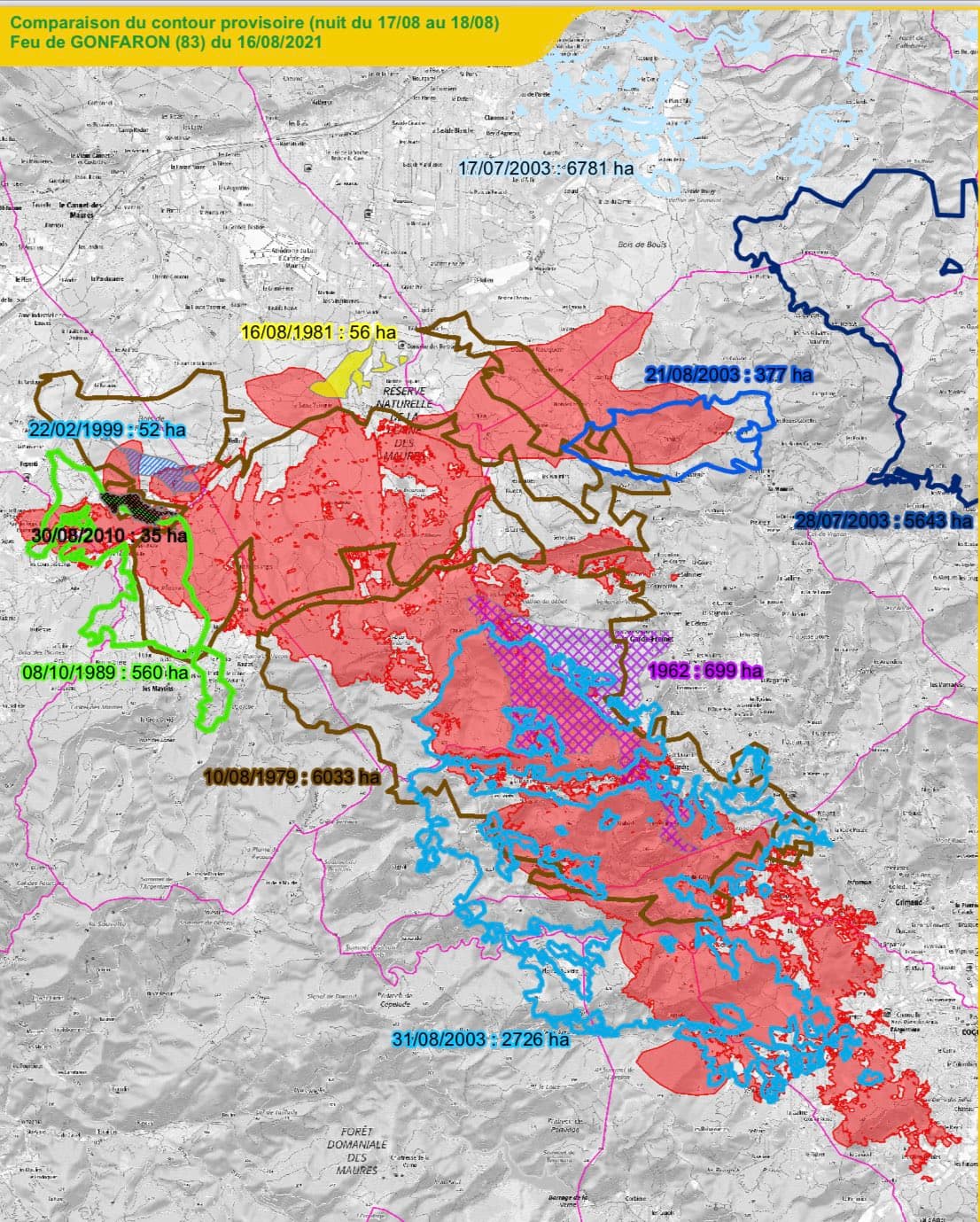 Il s'agit officiellement du feu le plus étendu en France métropolitaine depuis 31 ans, et les grands feux de la fin de l'été 1990... ayant déjà touché le département du Var et ce même massif des Maures. Car en effet, le département du Var possède une très grande surface végétative (58,3 % de sa superficie est boisée, représentant plus de 350.000 hectares). Massifs de la Sainte-Baume, des Maures, de l'Estérel, du Haut-Var ou encore des Monts Toulonnais, tous sont extrêmement exposés au risque d'incendie.