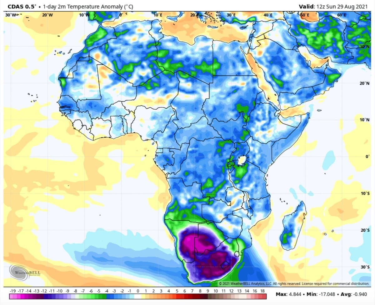 Sur le Sud du continent, un nouveau coup de froid a concernée l'Afrique du Sud à la fin du mois d'août avec de la neige sur les sommets de la région. Les températures se situaient par endroit plus de 15°C sous les normales de la période !