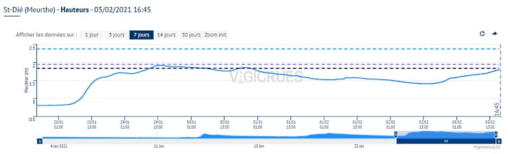Nouvelle hausse de la Meurthe (amont) à Saint-Dié (Vosges) ce 3 février 2021 - via Vigicrues