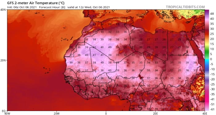 Températures maximales sur le nord de l'Afrique ce mercredi 6 octobre 2021 - via tropicaltidbits.com