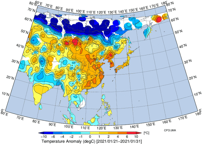 Carte des anomalies de températures en Asie sur la période du 21 au 31 janvier 2021 - via JMA (Agence météorologique du Japon)