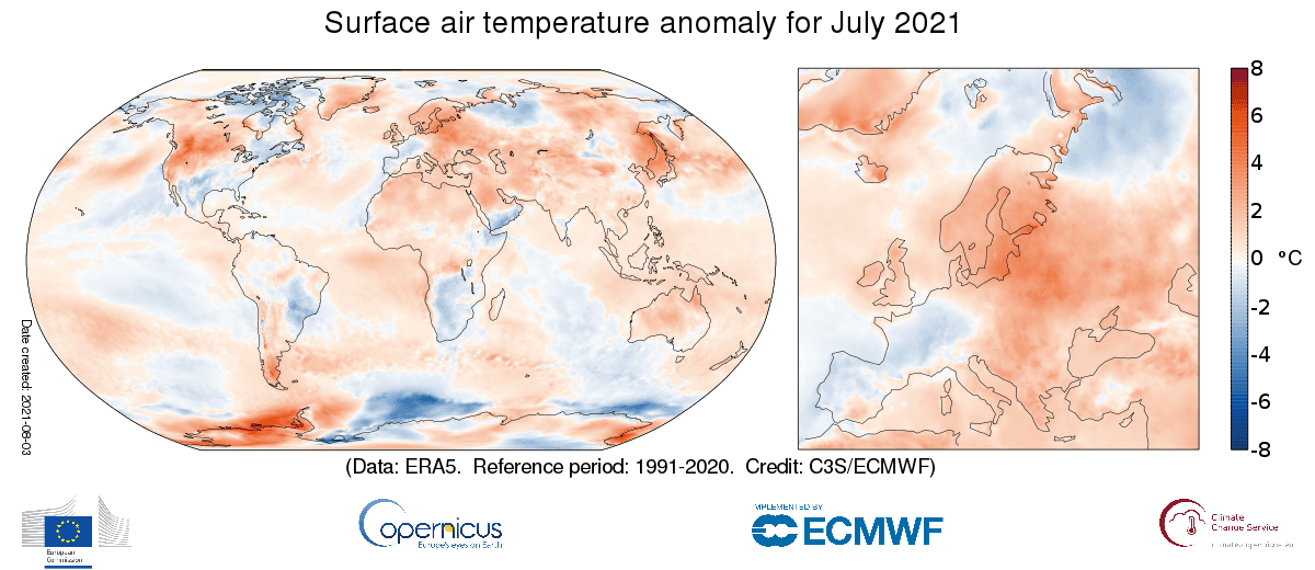La température moyenne européenne pour juillet 2021 était de 1.41°C supérieure à la moyenne 1991-2020 selon le programme européen de surveillance de la Terre "Copernicus", soit le 2e mois le plus chaud observé en Europe depuis le début des analyses en 1979. Le seul mois de juillet enregistré qui a été plus chaud en Europe a eu lieu en 2010, lorsque l'ouest de la Russie a connu une forte canicule et que la température moyenne européenne a été de 1.72 °C supérieure à son niveau de 1991-2020.