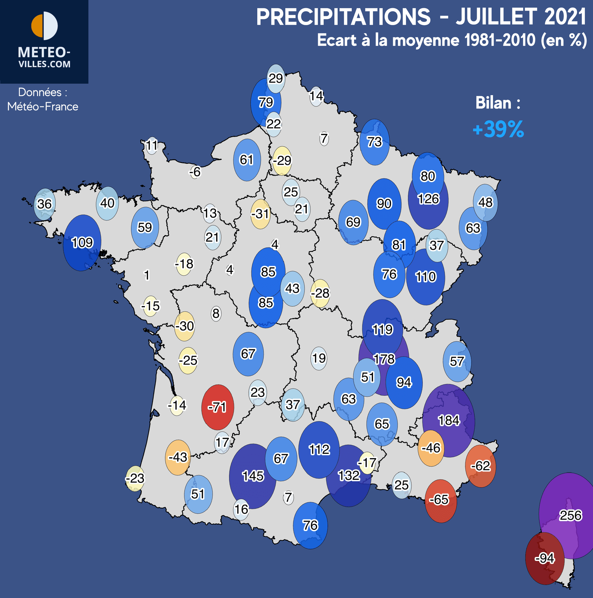 Anomalies des précipitations (en %) en juillet 2021 en France - Météo-Villes