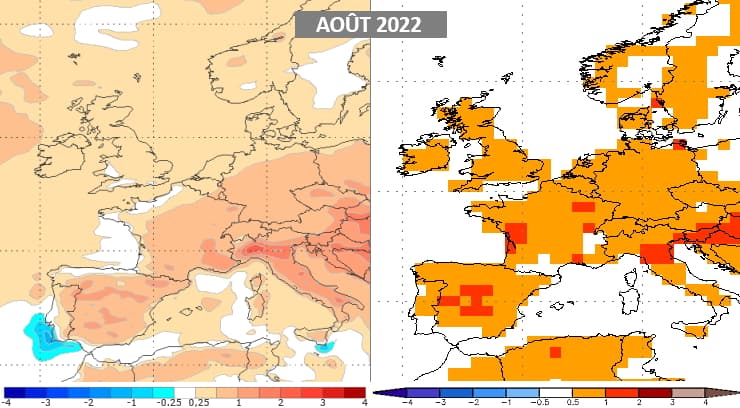 Les modèles européen (à gauche) comme américain à (droite) accordent leurs violons pour la projection des températures du mois d'août 2022. Une anomalie chaude se dégage sur l'ensemble de la France avec une tendance possiblement plus nette sur le sud et l'est de la France. Nous devrions donc assister à un mois globalement estival avec de possibles périodes de fortes chaleurs.