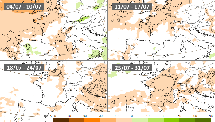 Une tendance sèche se dégage pour le mois de juillet 2022 selon les projections du modèle européen. La proximité de l'anticyclone sur le proche-Atlantique et les Îles Britanniques nous vaudrait de nombreuses journées stables, au contraire du mois de juin et de son caractère orageux très prononcé. Les déficits pluviométriques concerneraient alors la plupart des régions jusqu'au terme du mois.