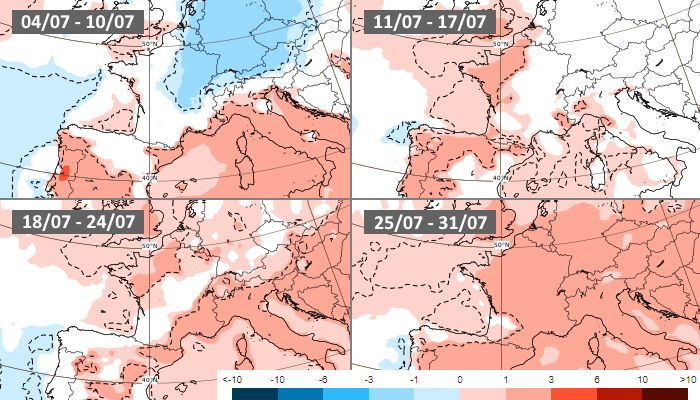 Le modèle européen mise sur une première décade de juillet restant tempérée avec des températures parfois un peu fraîches au nord-est (nuits fraîches mais après-midi agréables) et plus chaudes dans le sud, notamment vers la Méditerranée. L'anomalie chaude s'étendrait au cours de la deuxième décade de juillet puis concernerait l'ensemble du territoire d'ici la fin du mois, apportant une ambiance largement estivale.