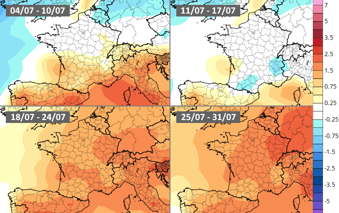 Projection de l'anomalie thermique en France pour juillet 2022 - Météo Villes