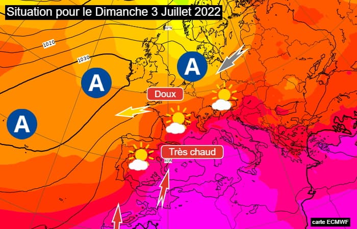 Après le passage d'un talweg jeudi 30 juin 2022 - associé à un front pluvieux précédé de quelques orages - une dorsale anticyclone reviendra sur la France pour le vendredi 1er juillet 2022. Le premier week-end du mois de juillet verra l'installation de l'anticyclone sur le proche-Atlantique, étendant son influence sur la France et les Îles Britanniques. L'air chaud remontera notamment sur le sud où le flux sera faible. Au nord, le flux de nord à nord-est maintiendra les températures à des niveaux simplement de saison.