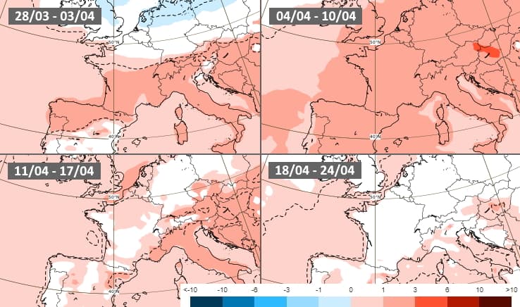 Son homologue américain est en accord quasi-total avec ce scénario temporairement frais sur les régions les plus au nord avant que la douceur ne l'emporte assez rapidement. La seconde partie du mois d'avril ne met en évidence aucune anomalie particulière.