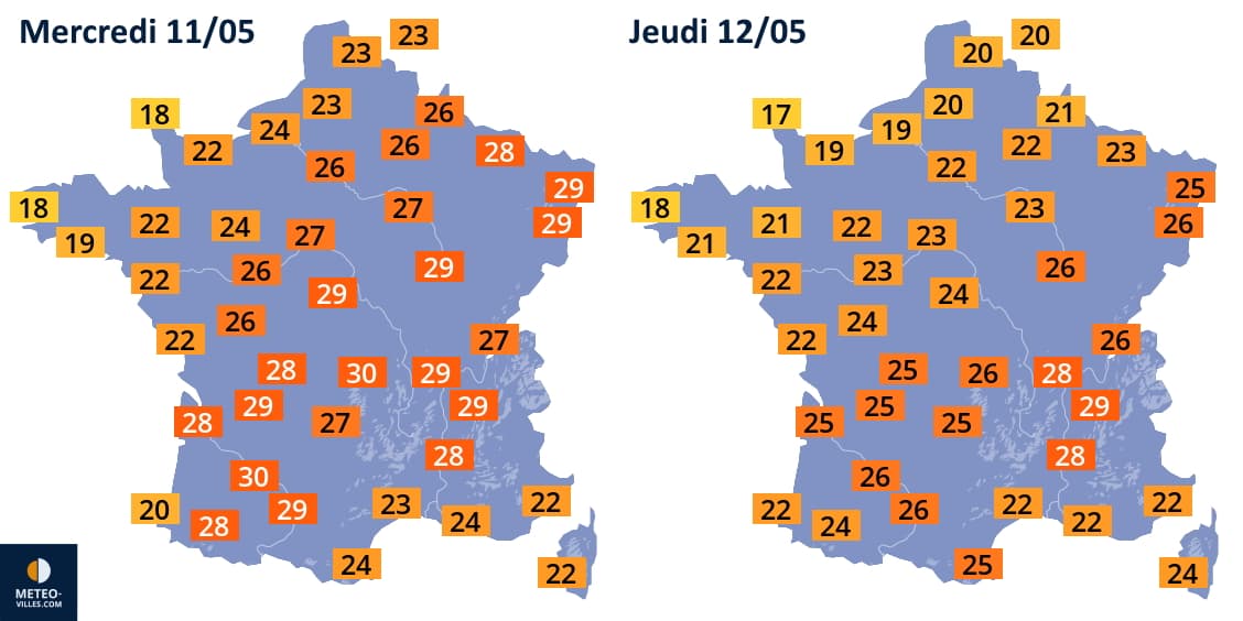 Températures maximales prévues les mercredi 11 et jeudi 12 mai 2022 - Météo Villes