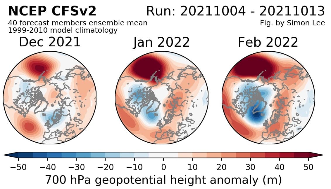 Anomalies mensuelles de géopotentiels sur l'Atlantique entre décembre 2021 et février 2022 - CFS