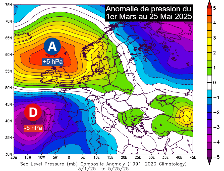 Il faut dire que ce printemps 2025 est atypique de par sa circulation atmosphérique dominante. Durant les mois de mars, avril et mai, les hautes pressions ont largement dominé les Îles Britanniques et la Mer du Nord. L'anomalie sur près de trois mois atteint +5 hPa au nord de l'Écosse, un chiffre remarquable et qui témoigne d'un blocage anticyclonique solide et durable. À l'inverse, les basses pressions ont largement dominé la péninsule ibérique avec une anomalie atteignant -5 hPa au large du Portugal.