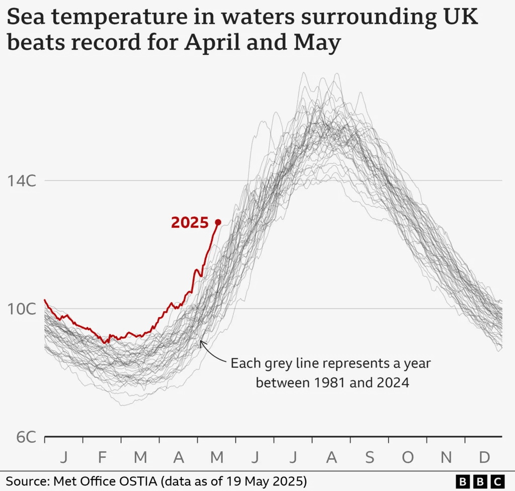 Température moyenne de l'eau en surface sur les côtes britanniques entre 1981 et 2024 et en 2025 (en rouge) - BBC