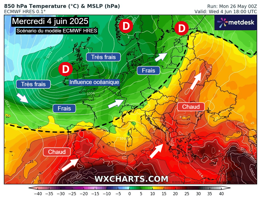 Selon le modèle européen ECMWF, l'influence océanique dépressionnaire reprendrait le dessus pour la première semaine de juin avec un temps humide et rafraîchi concernant une large partie ouest et nord du pays mais une chaleur un peu plus de saison en allant vers la méditerranée. Entre les deux, les orages pourraient s'avérer plus récurrents du sud-ouest aux reliefs de l'est.