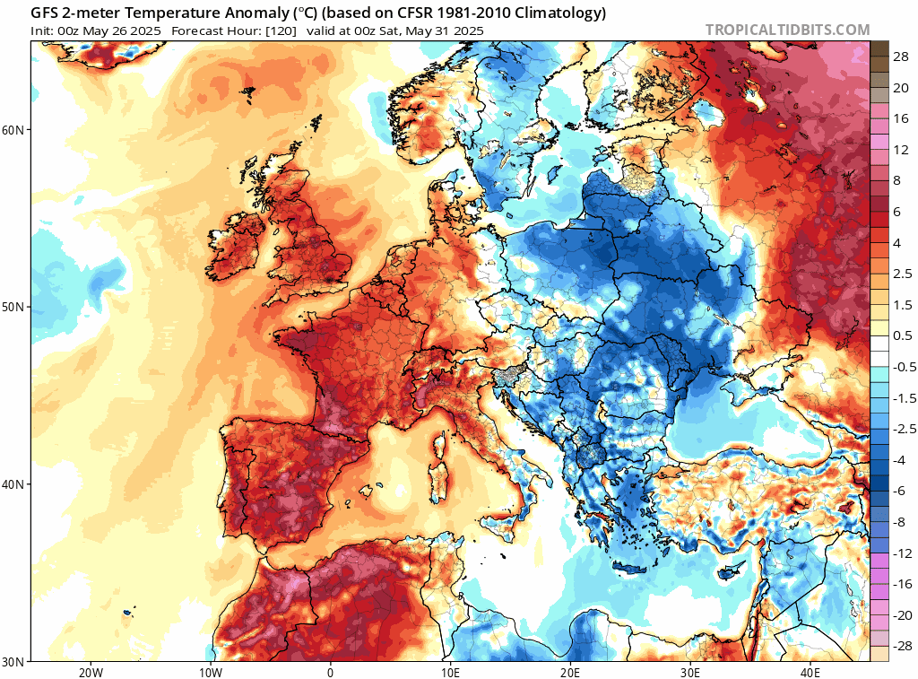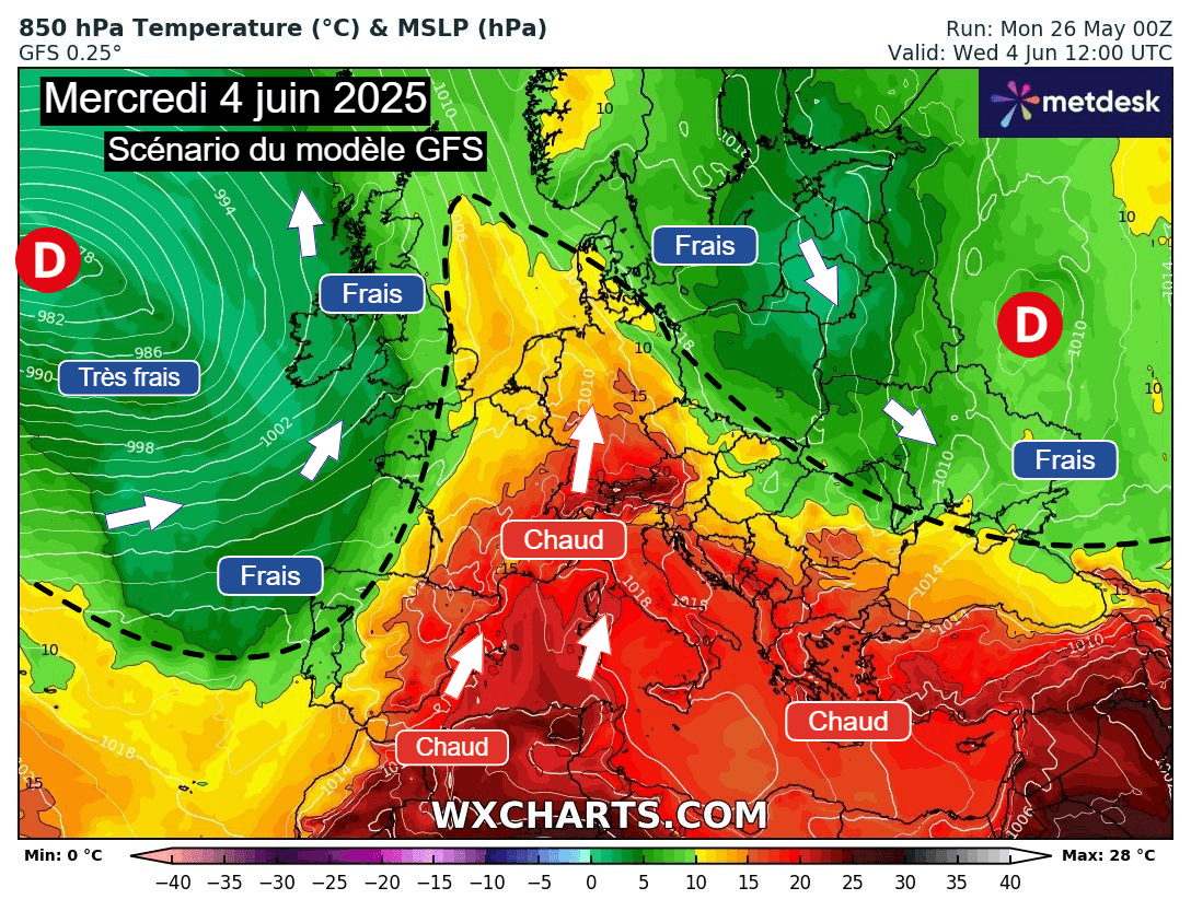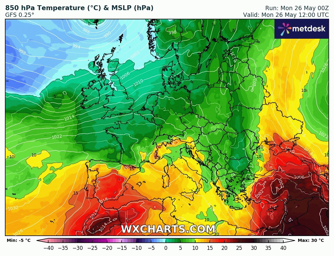 Animation des températures à 850 hPa sur l'Europe du 26 au 31 mai 2025 – Modèle GFS via WX CHARTS
