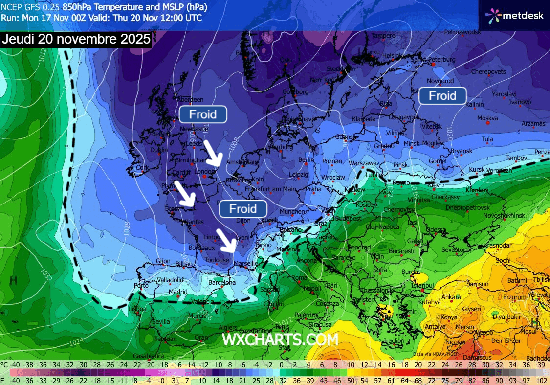 Situation atmosphérique sur l'Europe le 20 novembre 2025 – Modèle GFS via WX CHARTS