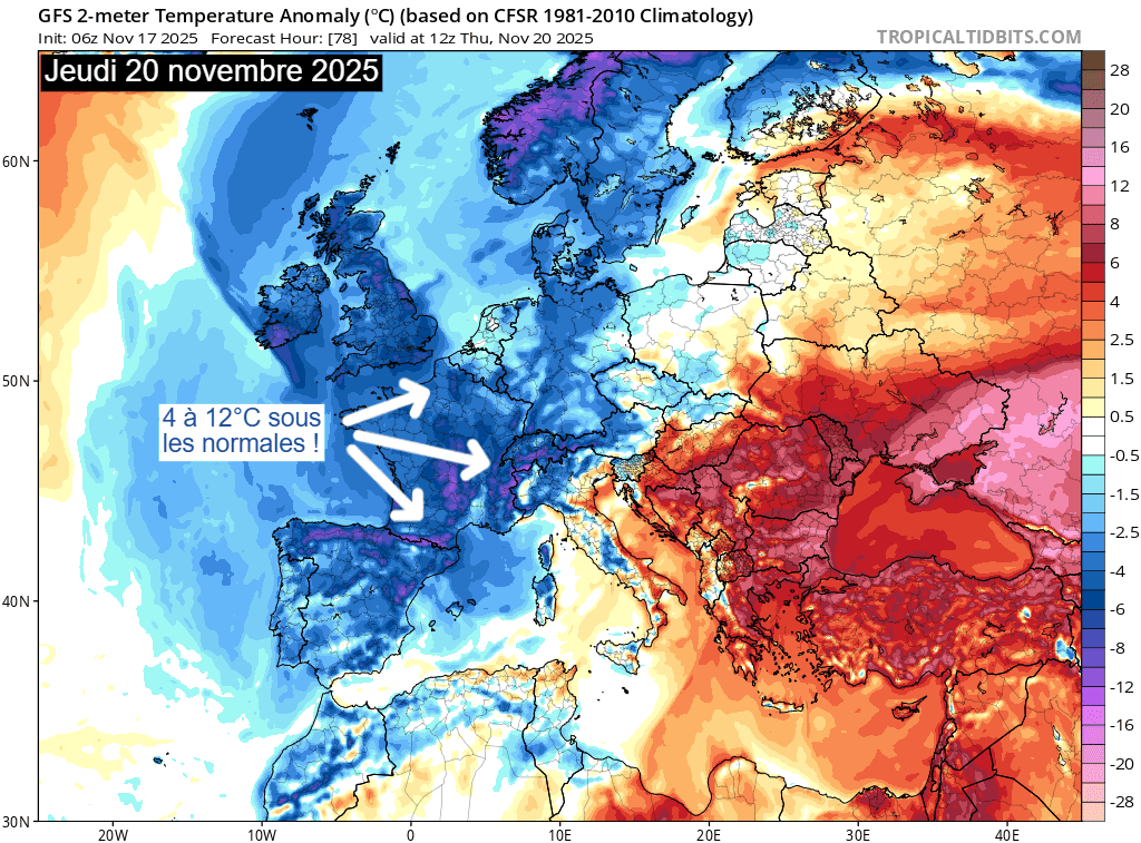 Anomalies de températures à 2m sur l'Europe le 20 novembre 2025 – Via TropicalTidBits