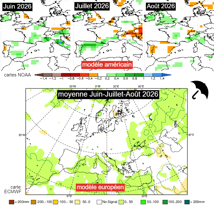 Anomalies pluviométriques envisagées par les modèle américain et européen pour l'été 2026 - NOAA & ECMWF