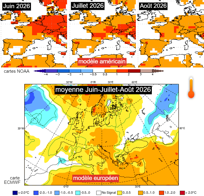 Anomalies thermiques envisagées par les modèle américain et européen pour l'été 2026 - NOAA & ECMWF