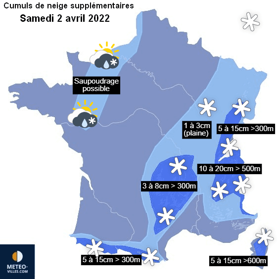 Accumulations neigeuses envisagées entre la nuit de vendredi 1er à samedi 2 avril et durant la journée de samedi 2 avril 2022 - Météo-Villes
