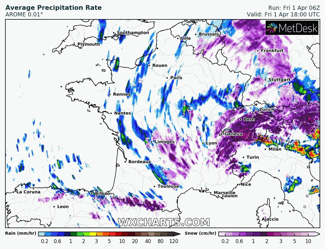 Animation des précipitations et du risque de neige du vendredi 1er à 18h au samedi 2 avril 2022 – Modèle Arome via WX CHARTS