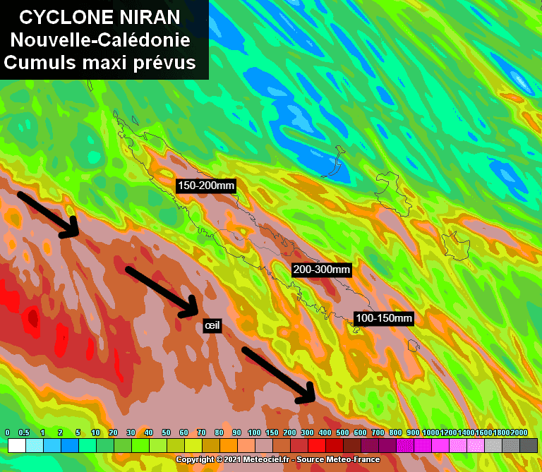 Outre les puissantes rafales et le risque de submersion marine (houle de plus de 6m à attendre sur les côtes Sud de l'île), les précipitations s'annoncent très intenses avec des cumuls pouvant atteindre les 300mm sur les reliefs intérieurs. Des inondations sont probables sur l'ensemble de la Grande Terre.