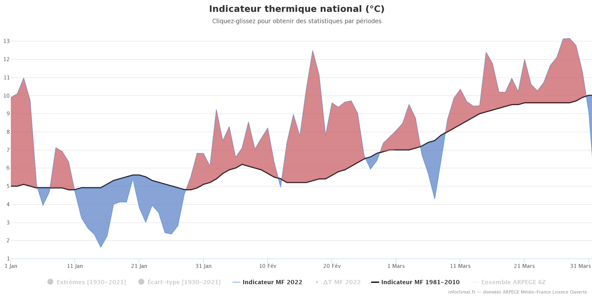 Indicateur thermique national et écart à la moyenne 1981-2010 - 1er trimestre 2022 - Infoclimat