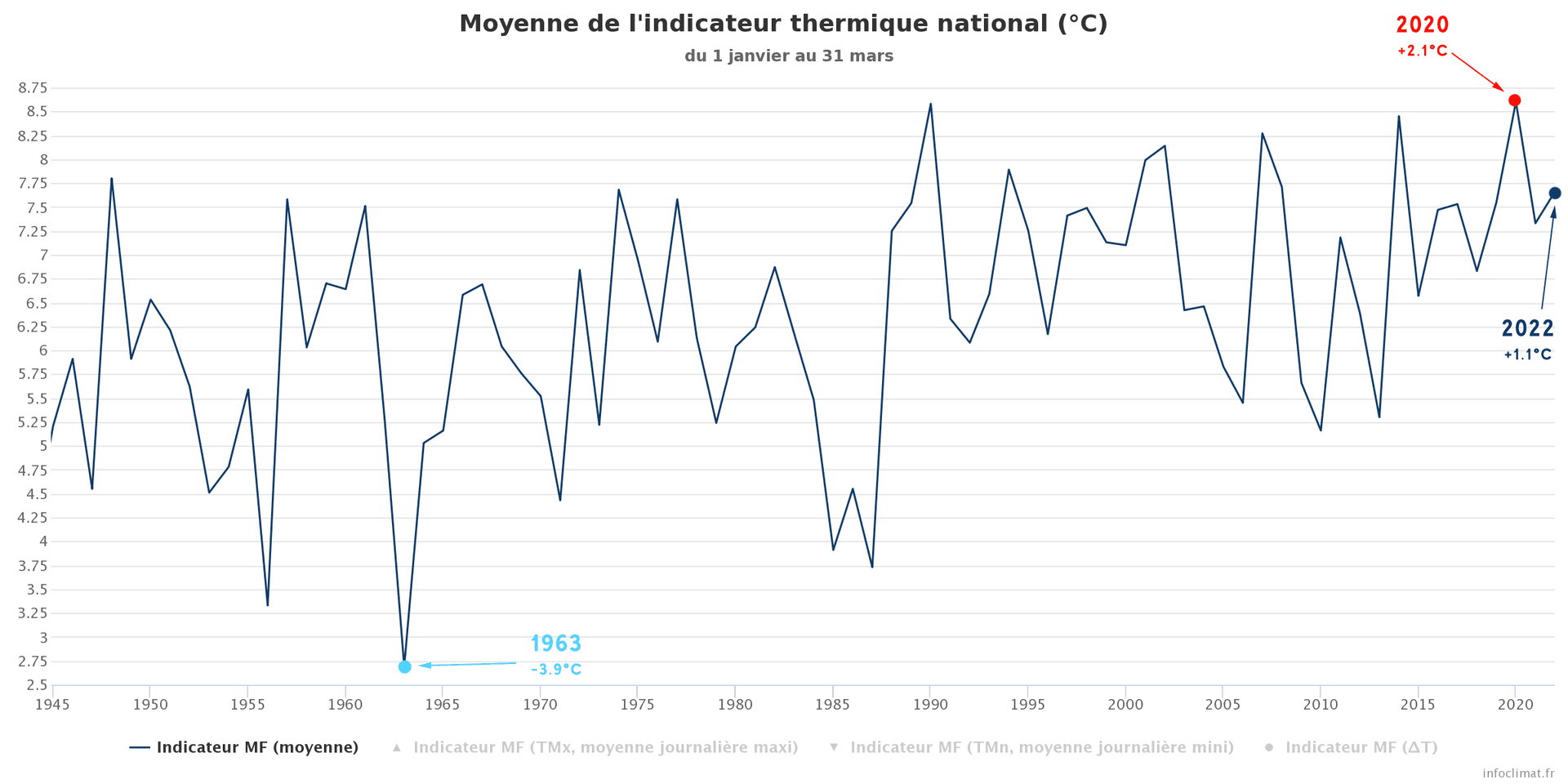 Moyenne de l'indicateur thermique national pour un 1er trimestre entre 1945 et 2022 - Infoclimat