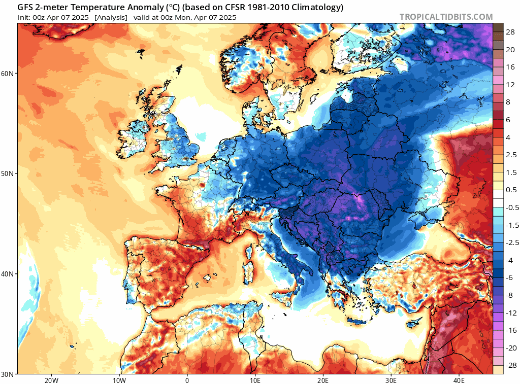 Animation des anomalies de températures sur l'Europe du 7 au 13 avril 2025 – via TropicalTidBits
