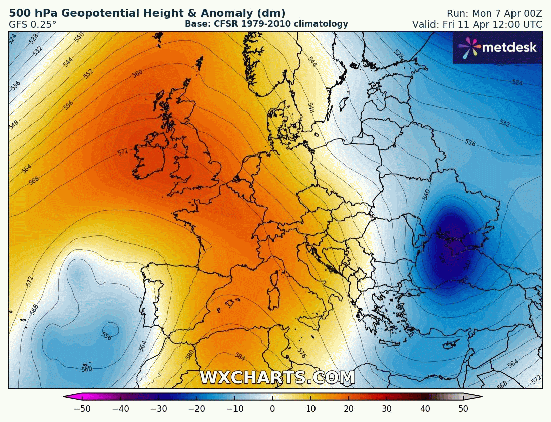 Animation des anomalies de géopotentiels sur l'Europe du 11 au 15 avril 2025 – Modèle GFS via WX CHARTS