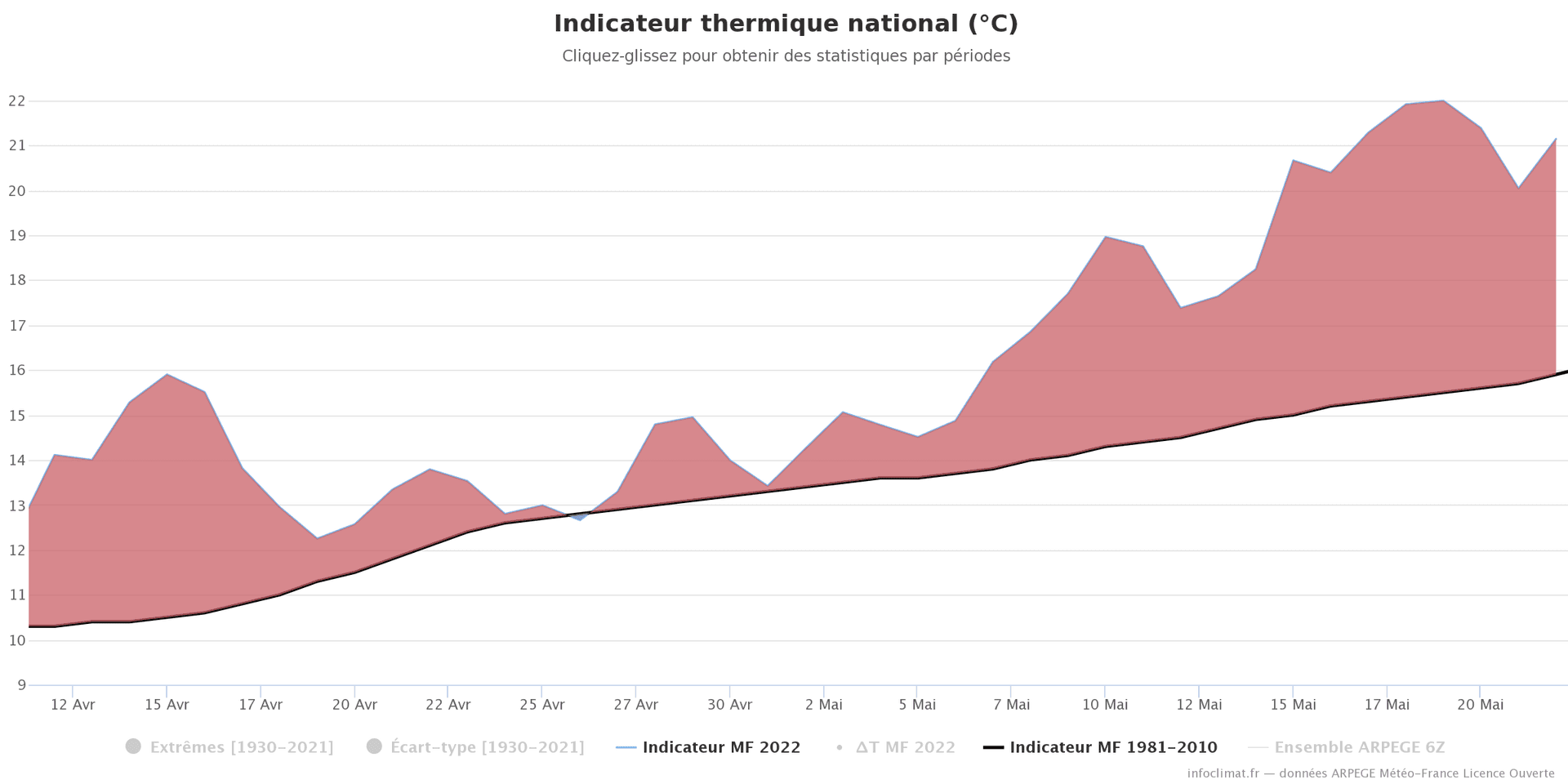 Indicateur thermique national depuis le 11 avril 2022 - écart à la moyenne 1981-2010 - Infoclimat