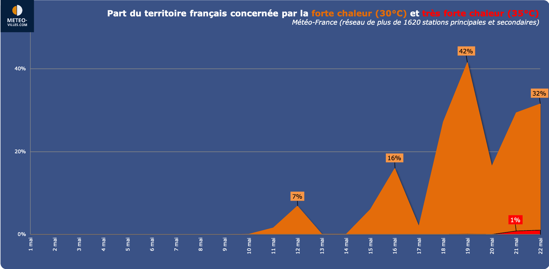 Entre le 19 et le 22 mai, ce sont même près d'une trentaine de stations qui ont franchi le seuil symbolique de la très forte chaleur (35°C), valeur exceptionnelle pour un mois de mai.