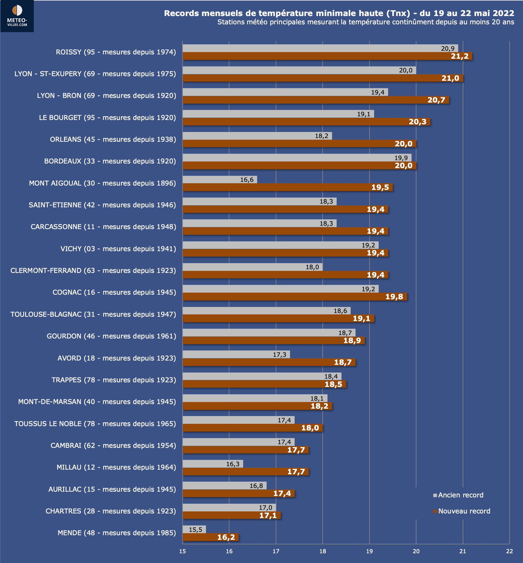 Températures minimales observées - nuit et matinée du 19 mai 2022 - Météo-Villes