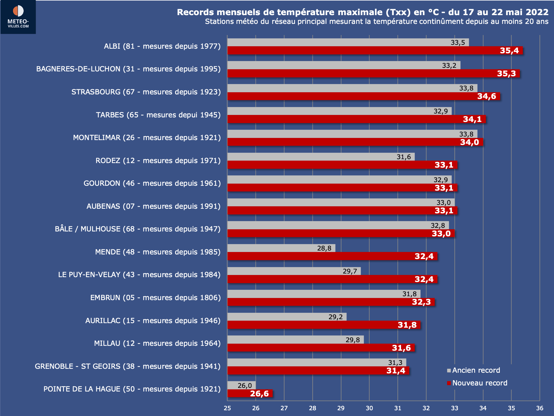Avec de telles températures observées, plusieurs dizaines de stations météorologiques ont battu leur record de chaleur pour un mois de mai ces derniers jours. Parmi elles, plusieurs stations du réseau principal ouvertes depuis 100 ans (Montelimar, Strasbourg, la Pointe de la Hague ou encore Embrun ouverte depuis le début du XIXe siècle pour cette dernière).