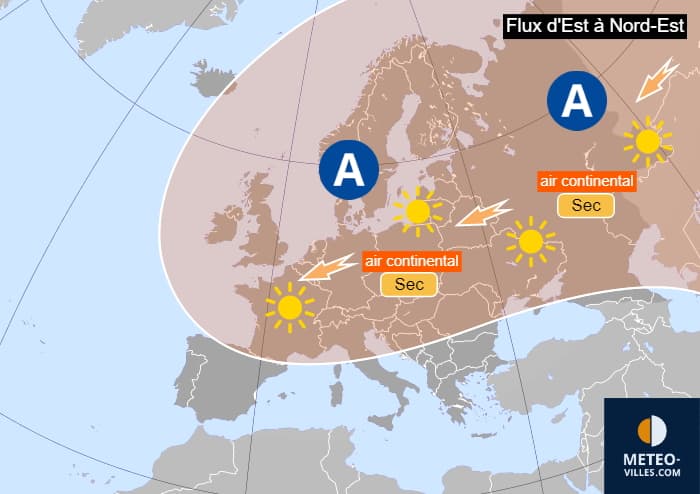 Si l'anticyclone se centre sur le nord et le nord-est du continent, c'est un flux de secteur est à nord-est qui se met en place sur la France. Ce flux, parfois nommé le Moscou-Paris, parcourt des milliers de kilomètres au dessus des terres et nous parvient donc avec très peu d'humidité. Il est donc souvent favorable à un temps bien ensoleillé mais également froid. Notons que certains flux d'est peuvent apporter des nuages sur les régions méditerranéennes.