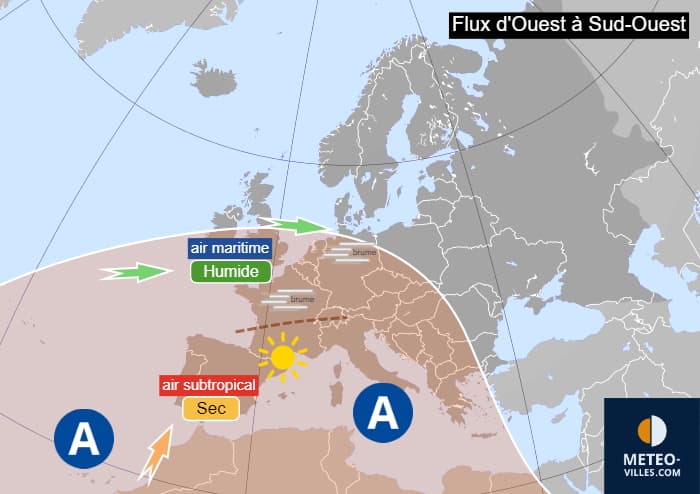 Lorsque l'anticyclone occupe une position plus classique vers l'archipel des Açores et qu'il étend son influence jusqu'à nous, le flux s'oriente au secteur ouest à sud-ouest. Cette influence apporte souvent un dégradé nord-sud avec des nuages bas dominants sur la moitié nord, alimentée par un air humide venu de l'océan, tandis que le soleil brille plus facilement au sud où l'air d'origine subtropical est moins chargé en humidité en passant au dessus de la péninsule ibérique. Le flux de sud-ouest facilitera une dissipation plus aisée des nuages bas, au contraire du flux d'ouest.