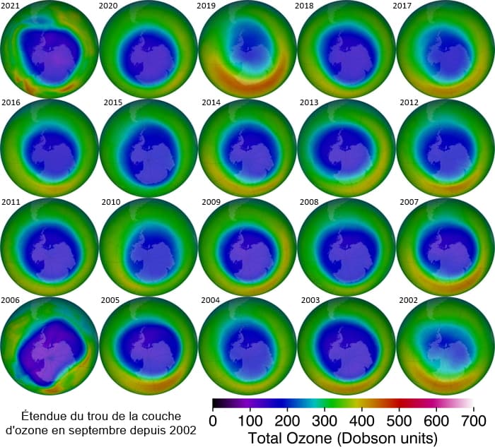 Comme chaque année, le trou de la couche d'ozone s'est rapidement formé au cours du mois d'août 2021. On constate une accélération et une intensification de sa formation au cours de ce mois de septembre, matérialisées par les couleurs virant au bleu foncé et au violet - correspondant à des taux d'ozone particulièrement faibles dans la stratosphère au dessus de l'Antarctique. Sa superficie dépasse d'ailleurs celle du continent polaire.
