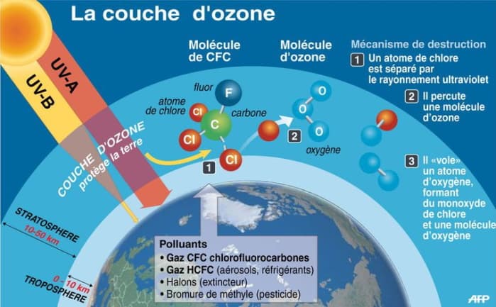 Schéma expliquant le processus de destruction de la couche d'ozone - via AFP