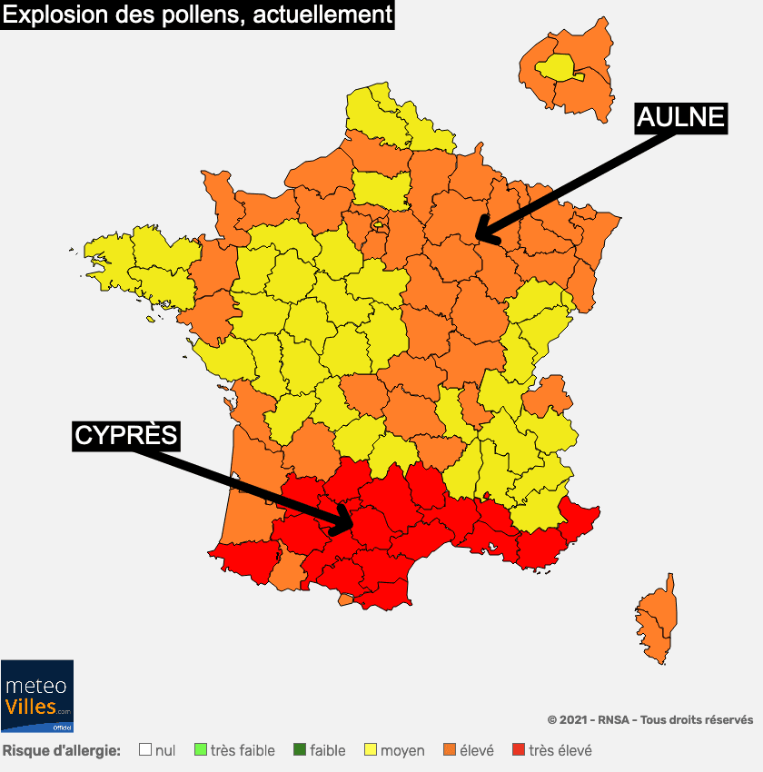 Toute la France est concernée par les pollens avec un risque allergique jugé très élevé de la Côte d’Azur au pays Basque en raison de l’explosion des pollens de cyprès sur ces régions. La floraison de ceux-ci s’est d’ailleurs engagée sur tout le pays et le risque allergique est également jugé moyen de l’Est de la Bretagne à la Saône-et-Loire.