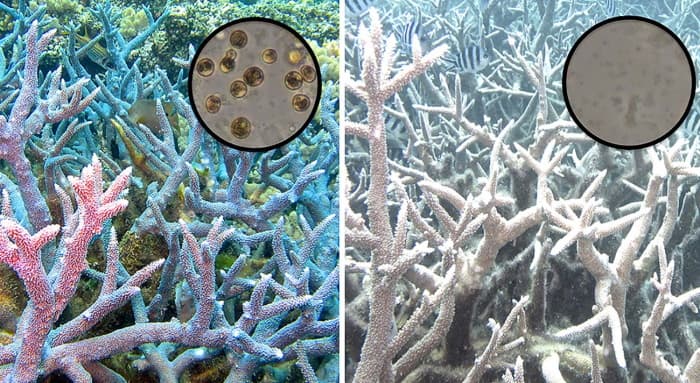 La mauvaise santé des coraux est l'une des conséquences les plus connues de l'augmentation de la température de l'eau de mer. En effet, ces espèces marines qui ne se développent que très lentement sont incapables de s'adapter à des changements climatiques trop brutaux. En l'occurrence, l'augmentation de la température de l'eau conduit à un phénomène de blanchiment des coraux. Si ce phénomène perdure durant plusieurs semaines et que la température de l'eau ne baisse pas, le corail meurt.